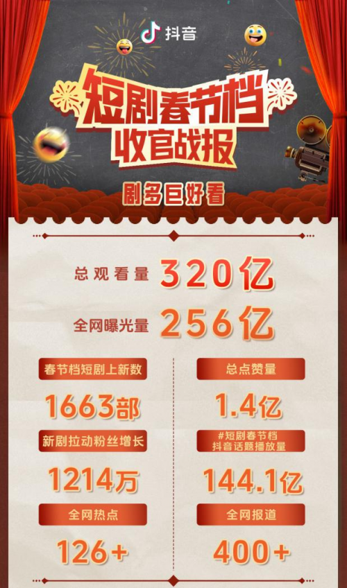 2025抖音短剧春节档:1663部短剧上新,320亿次观看网络2025-02-20 14:30